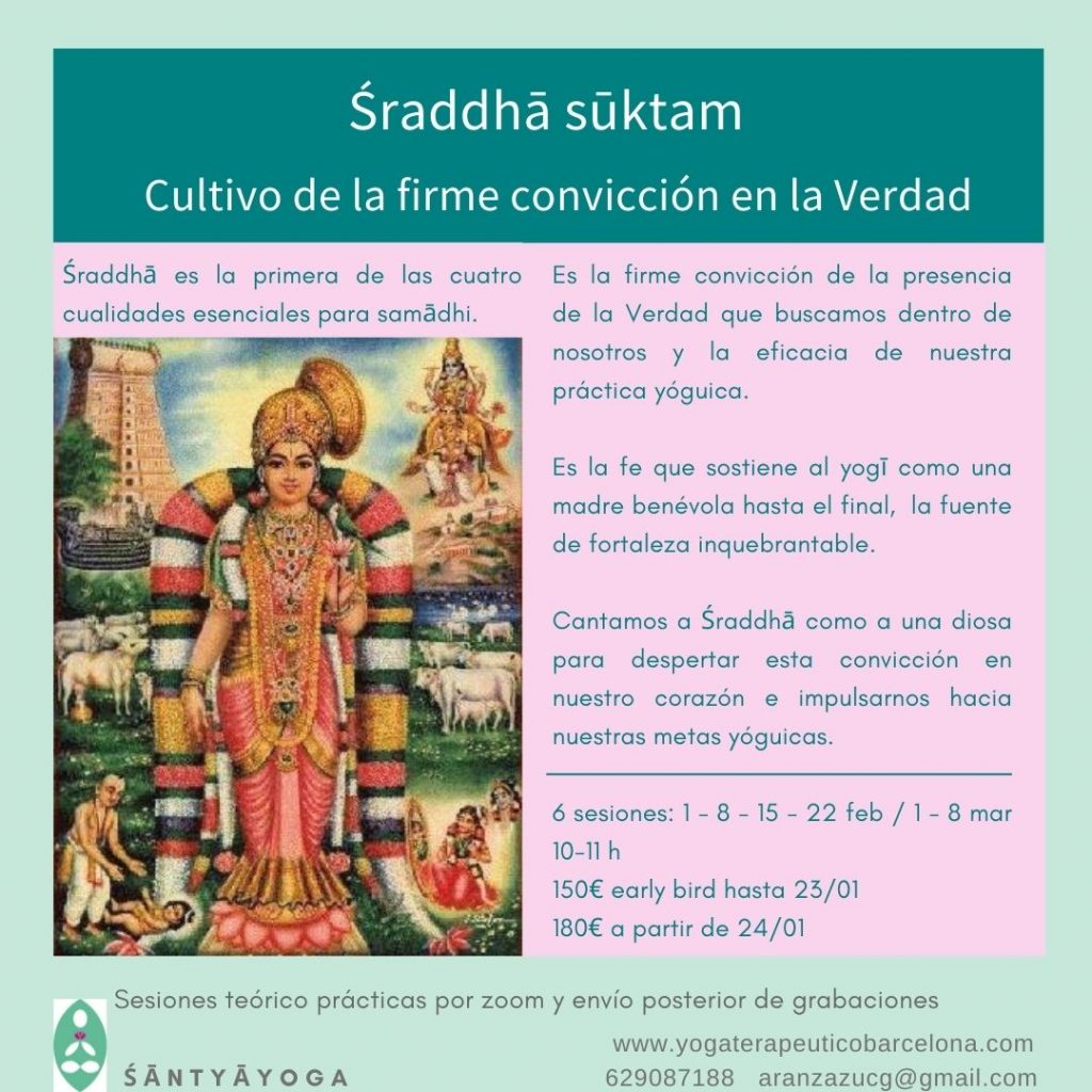 Śraddhā significa fe o convicción intensa y es la piedra angular del éxito en cualquier esfuerzo, ya sea en nuestro camino espiritual o personal. Nos permite perseverar incluso ante las mayores dificultades. Śraddhā sūktam es parte del Taittīrīya Brāhmaṇa, subraya el significado de Śraddhā y lo honra como una diosa. Inigún idioma occidental hace verdaderamente justicia a la palabra Śraddhā , la primera de las cuatro cualidades esenciales para alcanzar un alto ideal espiritual: samādhi. Śraddhā es la firme convicción con respecto a la presencia de la Verdad que buscamos dentro de nosotros y la eficacia de la técnica yóguica para permitirnos alcanzar la meta.Es la firme convicción de la presencia de la Verdad que buscamos dentro de nosotros y la eficacia de nuestra práctica yóguica. Es la fe que sostiene al yogī como una madre benévola hasta el final, la fuente de fortaleza inquebrantable. Cantamos a Śraddhā como a una diosa para despertar esta convicción en nuestro corazón e impulsarnos hacia nuestras metas yóguicas.