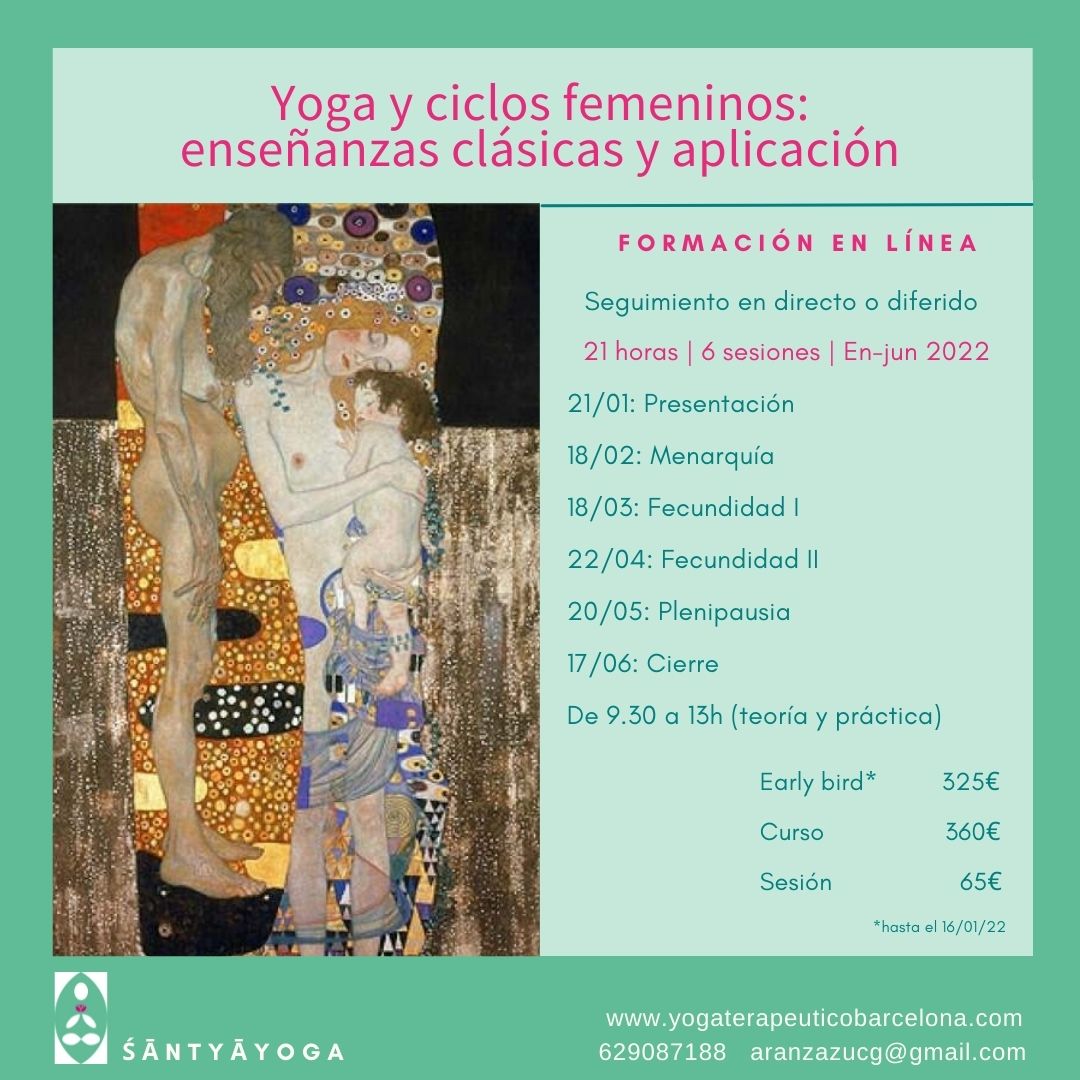 Yoga y ciclos femeninos: enseñanzas clásicas y su aplicación es un monográfico de 21h sobre ciclicidad femenina. Se estudian los diferentes y complementarios ciclos de lo femenino desde el punto de vista del yoga y la antroposofía a lo largo de la vida de la mujer y se enseñan prácticas tradicionales para cada etapa y momentos dentro de ellas. Son 6 sesiones de 3h 30 min grabadas de enero a julio de 2022.